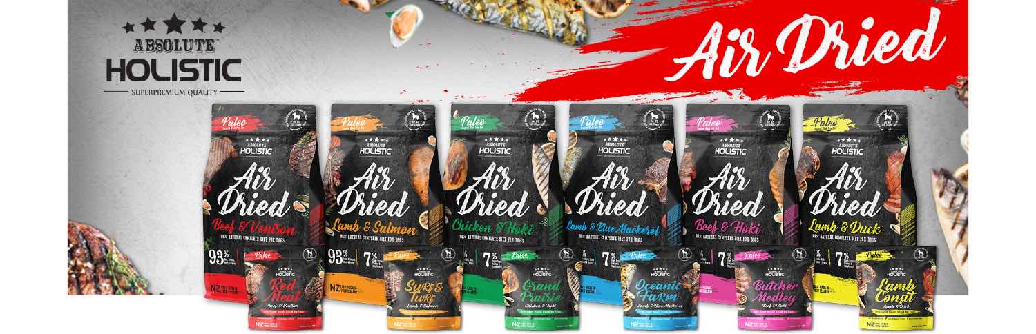 Absolute Holistic offers a diverse range of products catering to different pet types and needs, including air-dried dog food, grain-free options, wet food for cats and dogs, and treats that cater to the nutritional needs of pets, ensuring there's something for every pet.