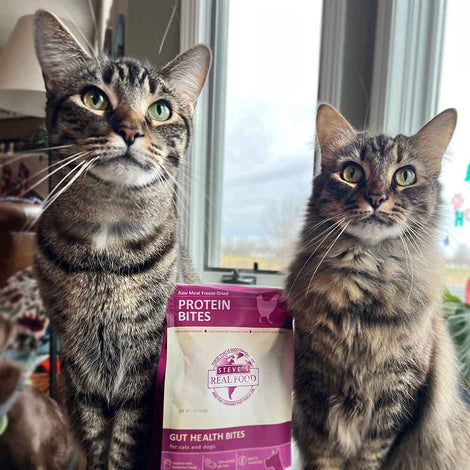 Steve’s Real Food Protein Bites Freeze-Dried Treats For Cats & Dogs are scrumptious treats enhanced with Gussy Gut’s veterinarian-formulated organic fermented food blend, making them great for digestive health.