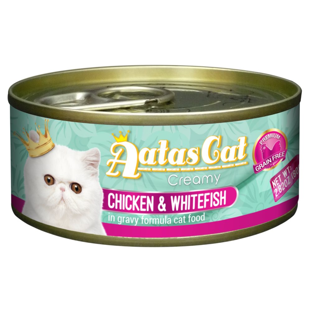 The main ingredients in this cat food are chicken, whitefish, and thickening agents (modified tapioca starch, xanthan gum).