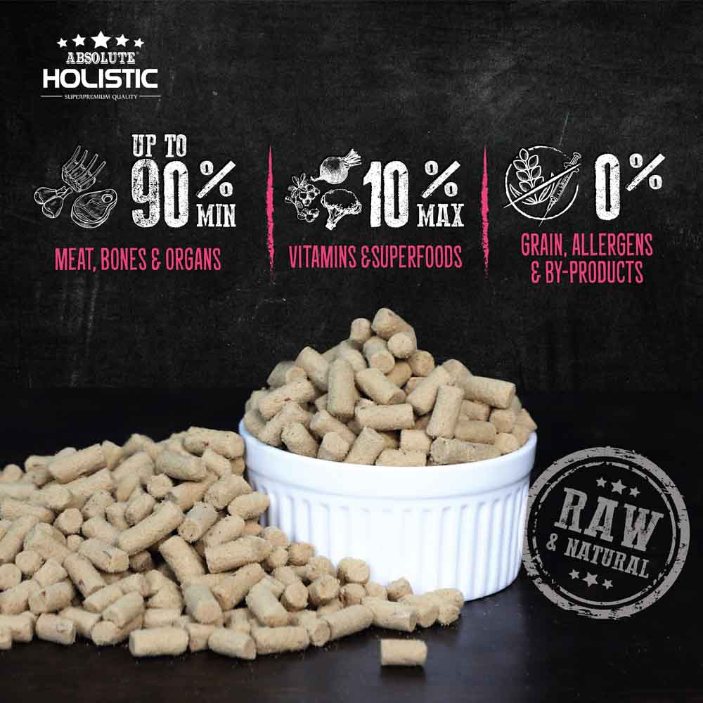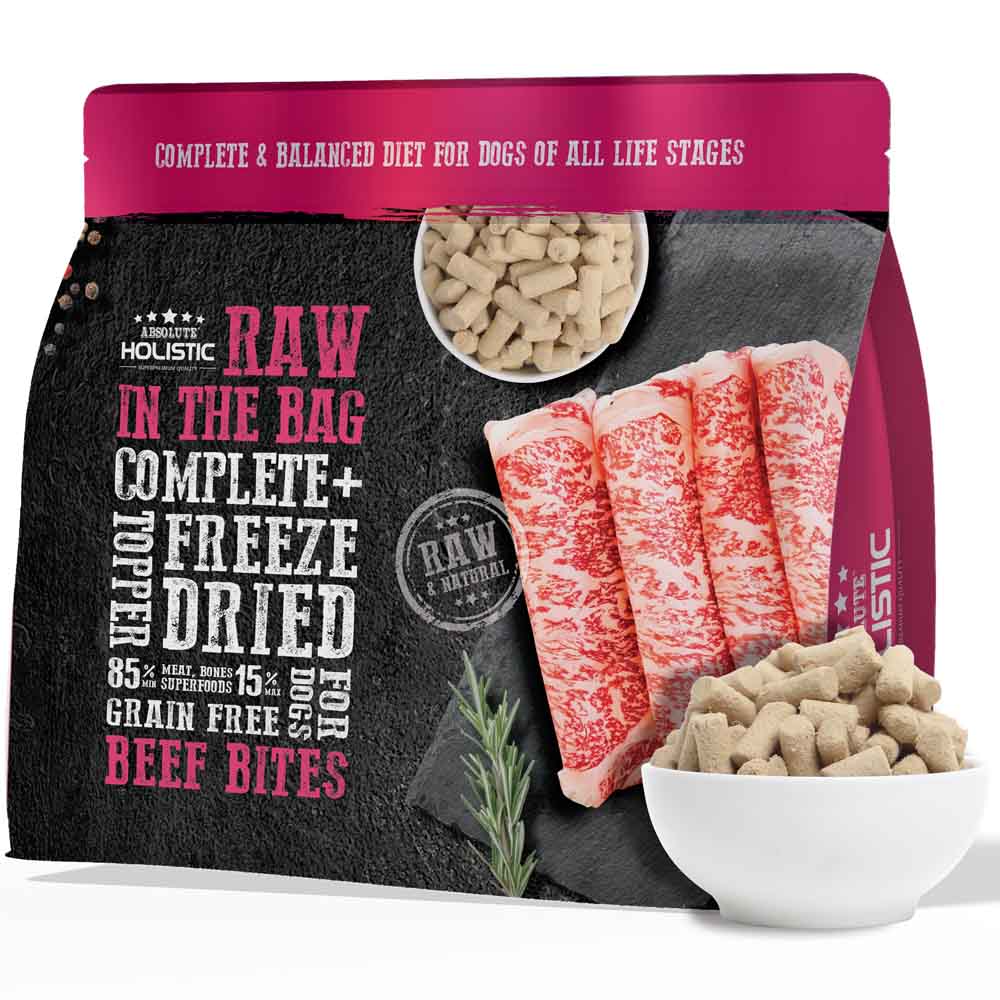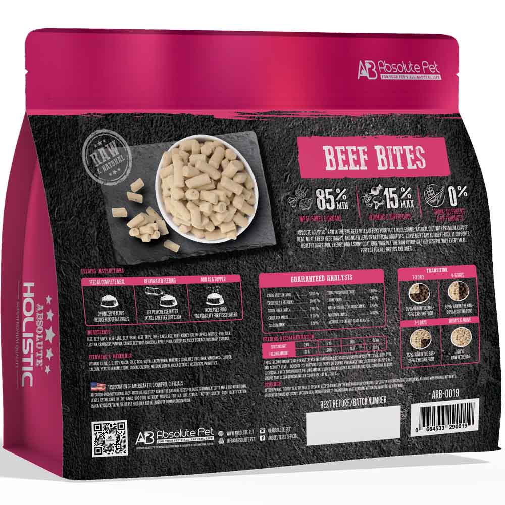 Absolute Holistic® Raw In The Bag Beef Bites for Dogs Is formulated to meet the nutritional levels established by the AAFCO dog food nutrient profiles for all life stages.