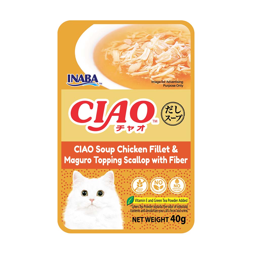 The main ingredients in this cat food are Chicken Fillet, Tuna, Scallop, Modified Tapioca Starch, Flavoring Agents, Cellulose, Scallop Extract, Guar Gum, Bonito Extract Powder, Vitamin E, Carrageenan, Fructooligosaccharides, and Green Tea Powder.