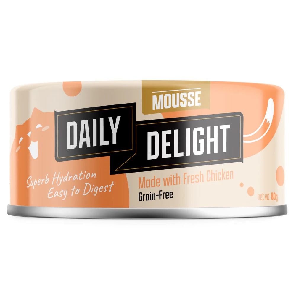 Daily Delight Mousse Canned Cat Food uses Western Pacific Ocean tuna or fresh deboned chicken. Crafted with minimal ingredients, Daily Delight Mousse contains no by-products and finished with a smooth texture, digestion and absorption is made easier for senior cats and growing kittens.