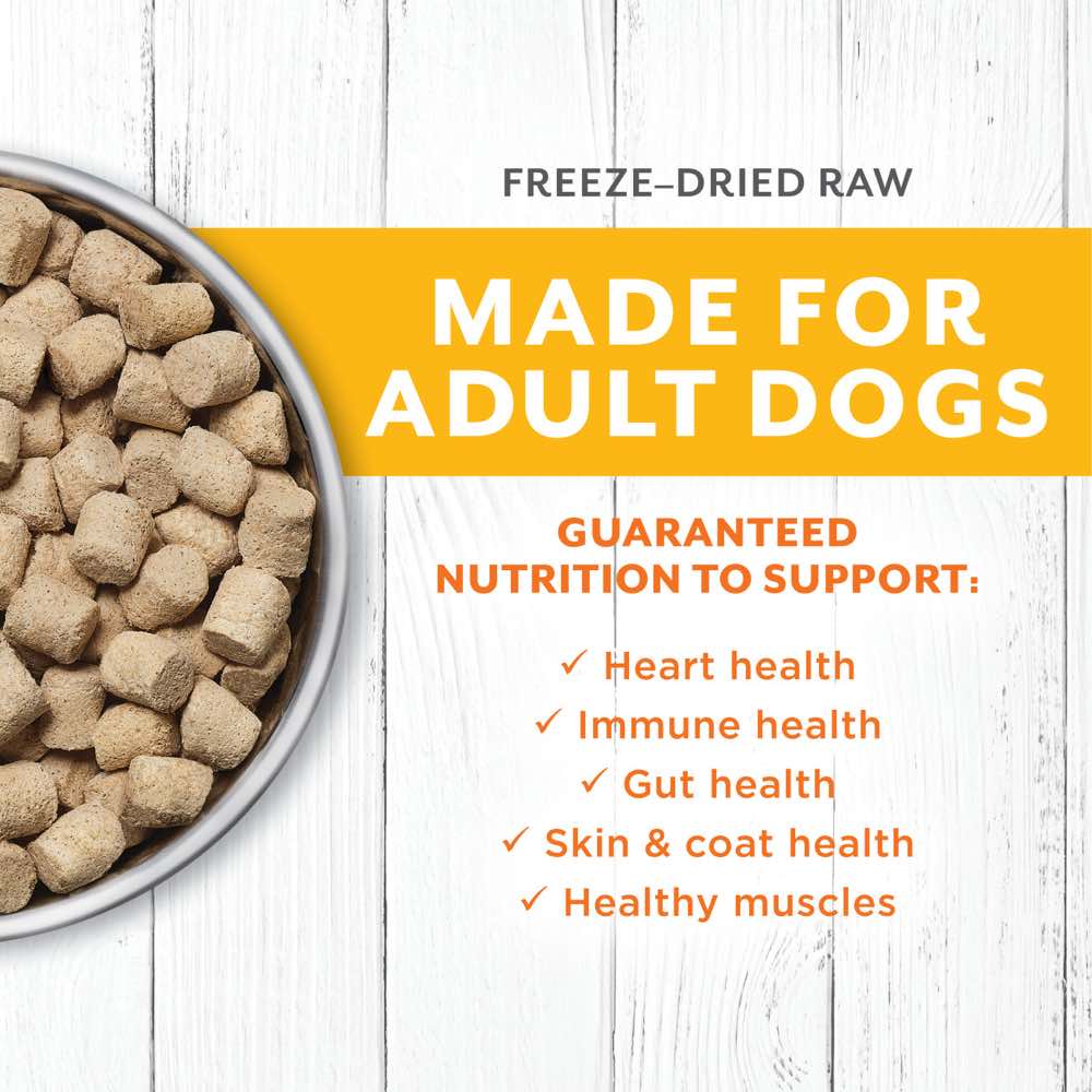 Keep freeze-dried raw on your pantry shelf for an easy-to-serve raw meal—just scoop and serve like kibble or add water for extra moisture