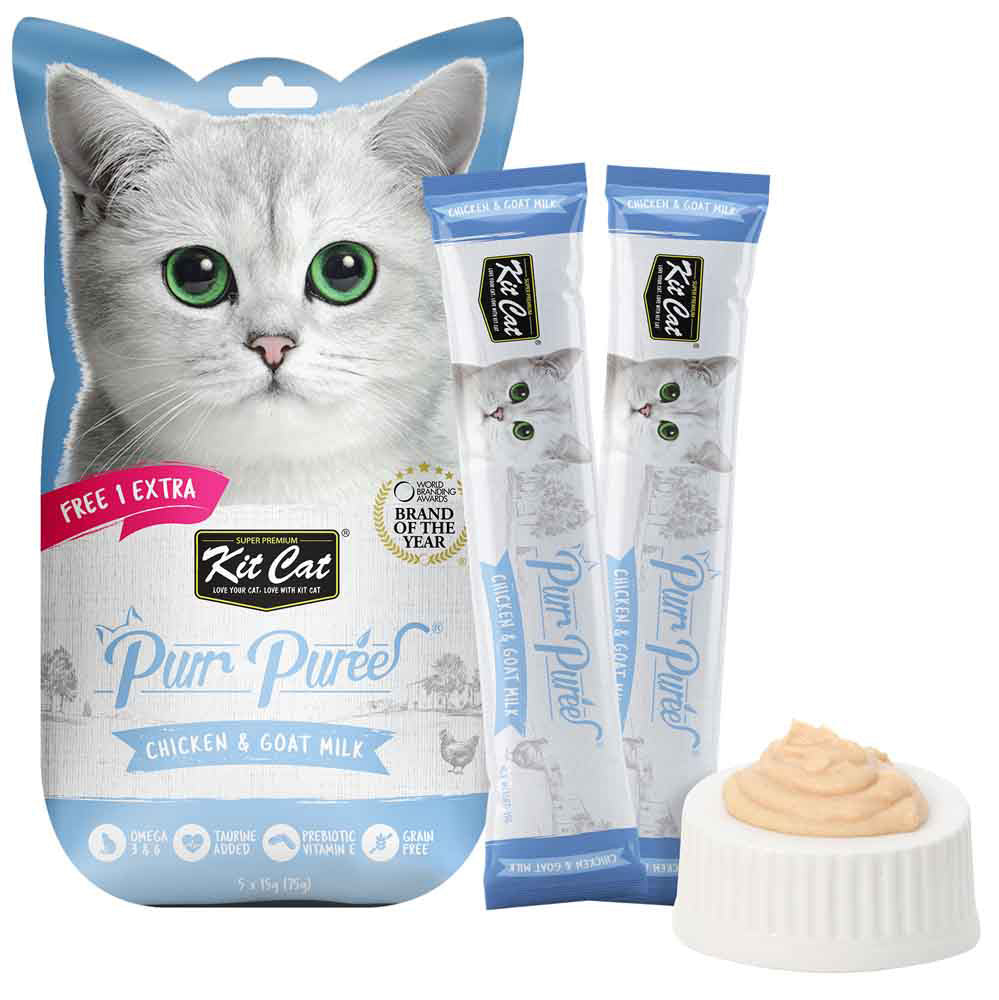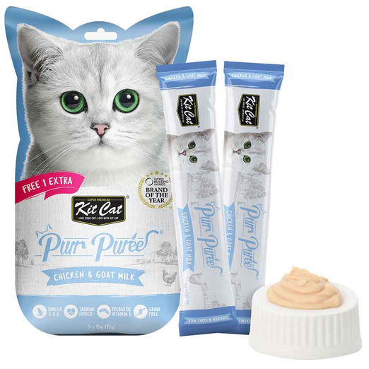 Kit Cat Purr Puree Chicken & Goat Milk Liquid Cat Treats are created by nutritionists who are also cat lovers. Each pack is made with the goodness of carefully selected high quality ingredients that are; 100% natural and free from grains, preservatives and artificial colours.