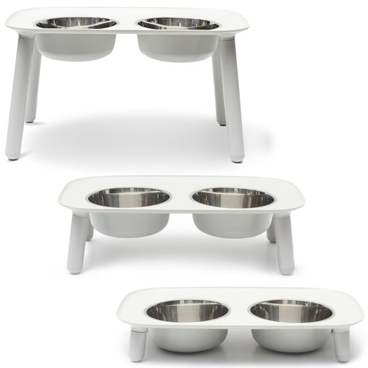 This raised double diner not only accommodates food and water with its 2 stainless steel dog bowl inserts and contains spills with its wide lip and raised edge border, but it also grows with your dog!