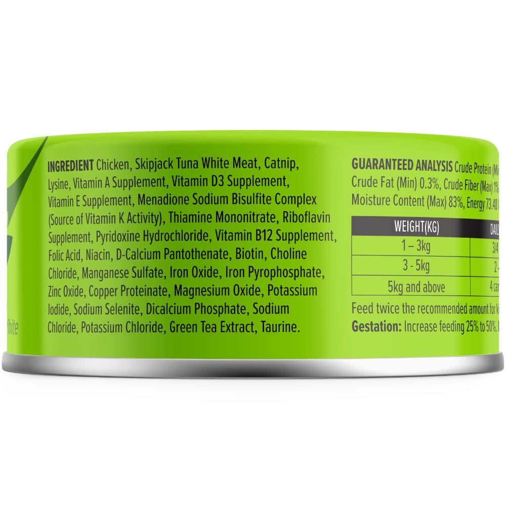 The main ingredients in this cat food are chicken, skipjack tuna white meat, catnip, lysine, and various essential vitamins and minerals.