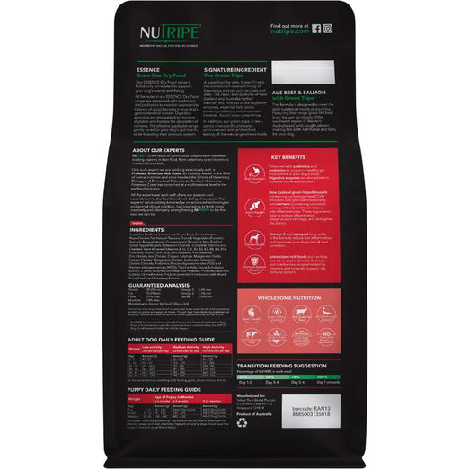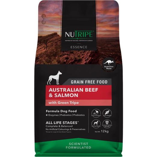 The main ingredients in this dog food are Australian beef, salmon with green tripe, sweet potatoes, peas, and chicken fat.