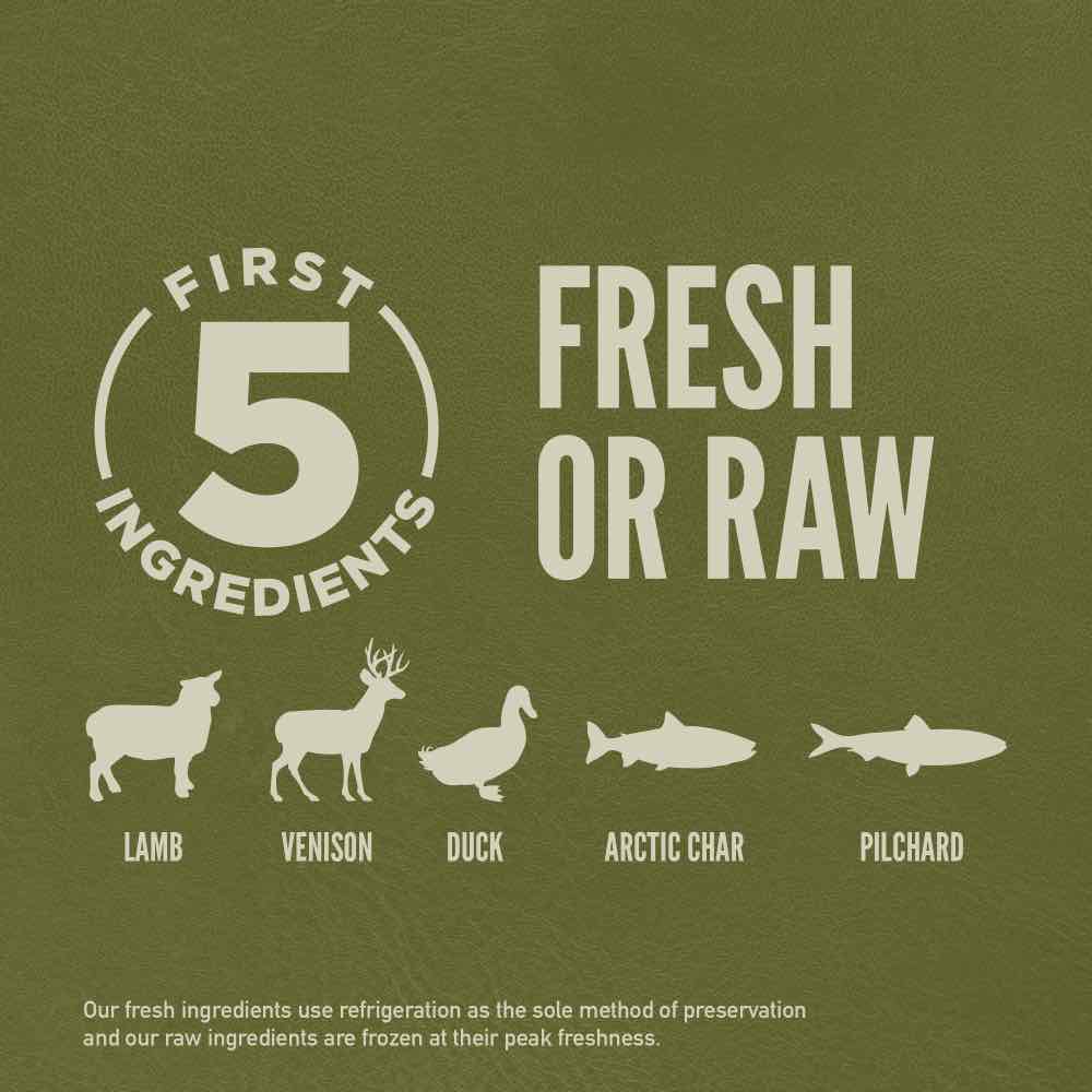 • The first 5 ingredients are raw lamb, venison, duck, and fish ingredients*.