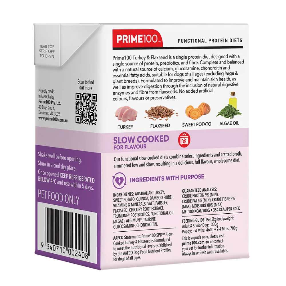 Prime100 Turkey & Flaxseed is a single protein diet designed with a single source of protein, prebiotics, and fibre. Complete and balanced with a natural source of calcium, glucosamine, chondroitin and essential fatty acids, suitable for dogs of all ages (excluding large & giant breed puppies). Formulated to improve and maintain skin health, as well as improve digestion through the inclusion of natural digestive enzymes and fibre from flaxseeds. No added artificial colours or flavours.