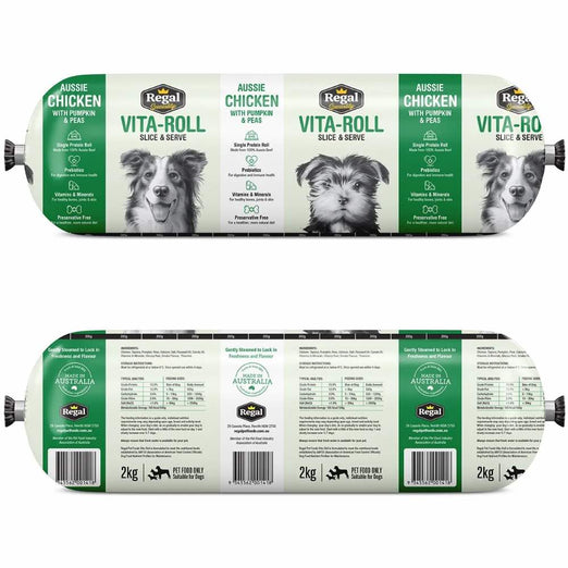 Regal Chicken with Pumpkin & Peas Frozen Roll Dog Food is a preservative free single Protein Diet. Enriched with Vitamins & Minerals & Australian Farm Grown Vegetables.