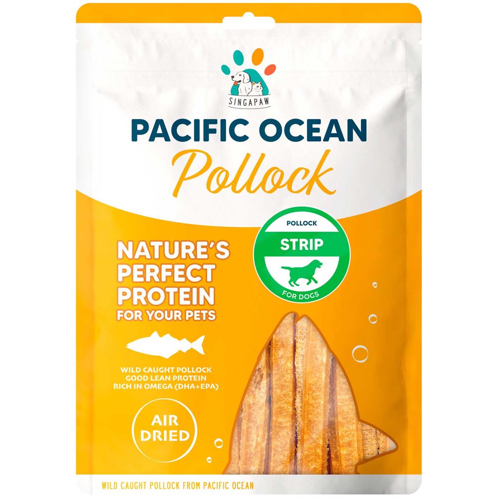SINGAPAW Pacific Ocean Pollock Strip treats are made using fresh, sustainable, 100% wild-caught pollock from the Pacific Ocean, air-dried to retain its natural taste and nutritional value.