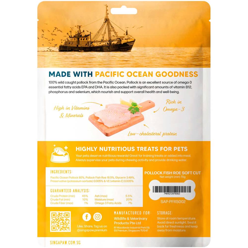 Pollock with Fish Roe Soft Cuts are highly nutritious treats for dogs, packed with healthy proteins of pollock meat and fish roe, which are also an excellent source of vitamins and minerals.