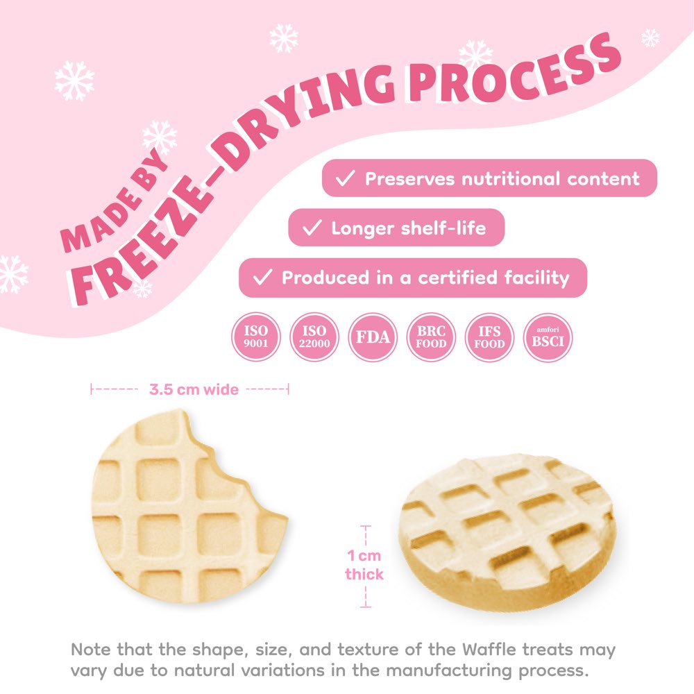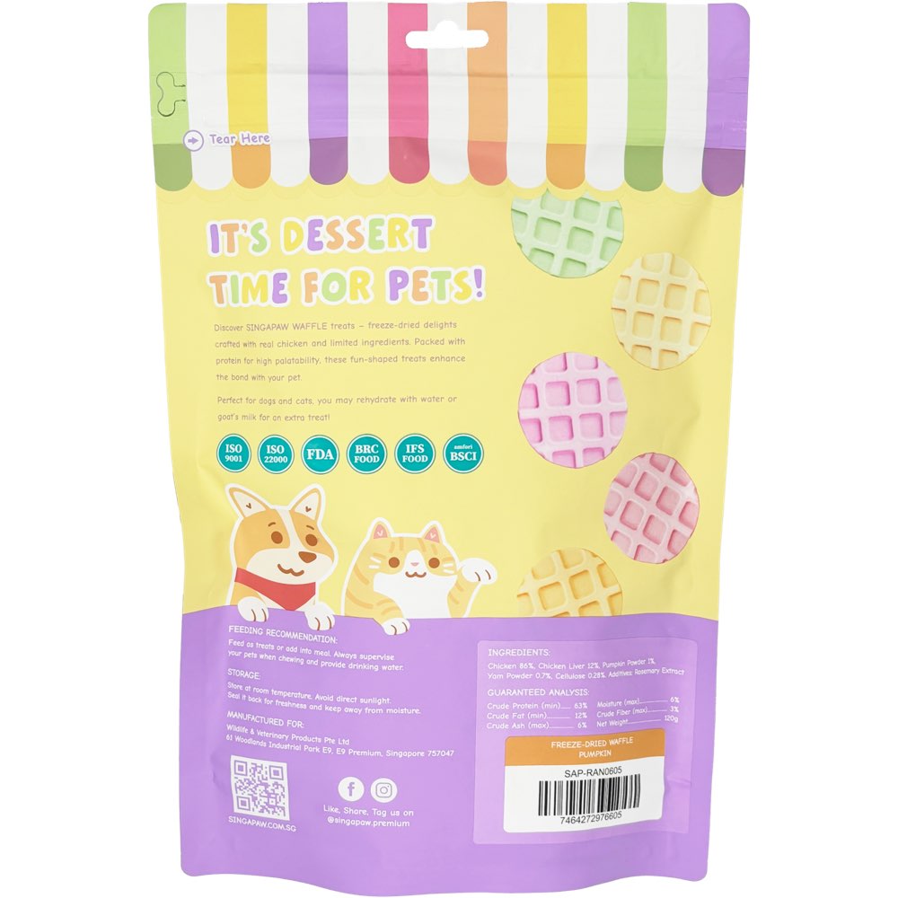 SINGAPAW WAFFLE freeze-dried treats for dogs and cats are made with real chicken meat and limited ingredients.