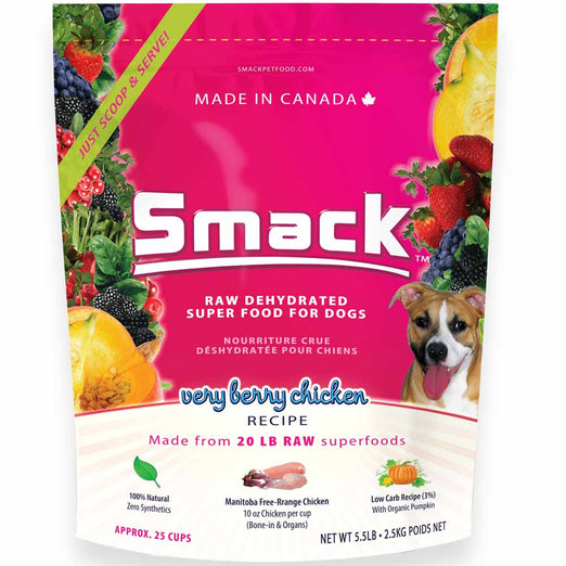 Smack Very Berry Chicken Raw Dehydrated Dog Food uses only the highest quality ingredients. We steer clear of the bad stuff. Every recipe is carefully composed to support your dog with: