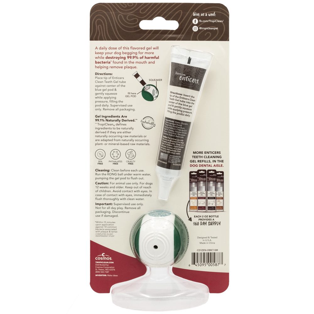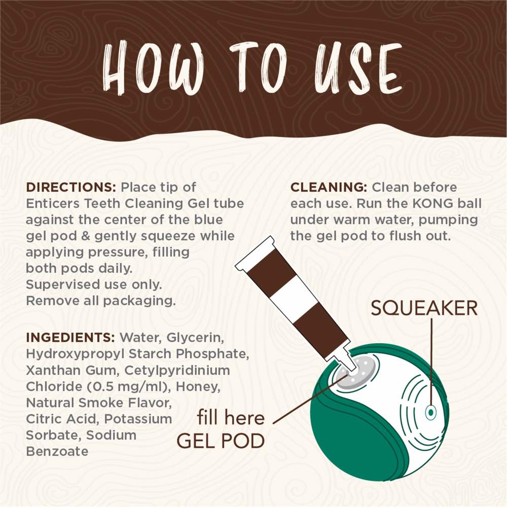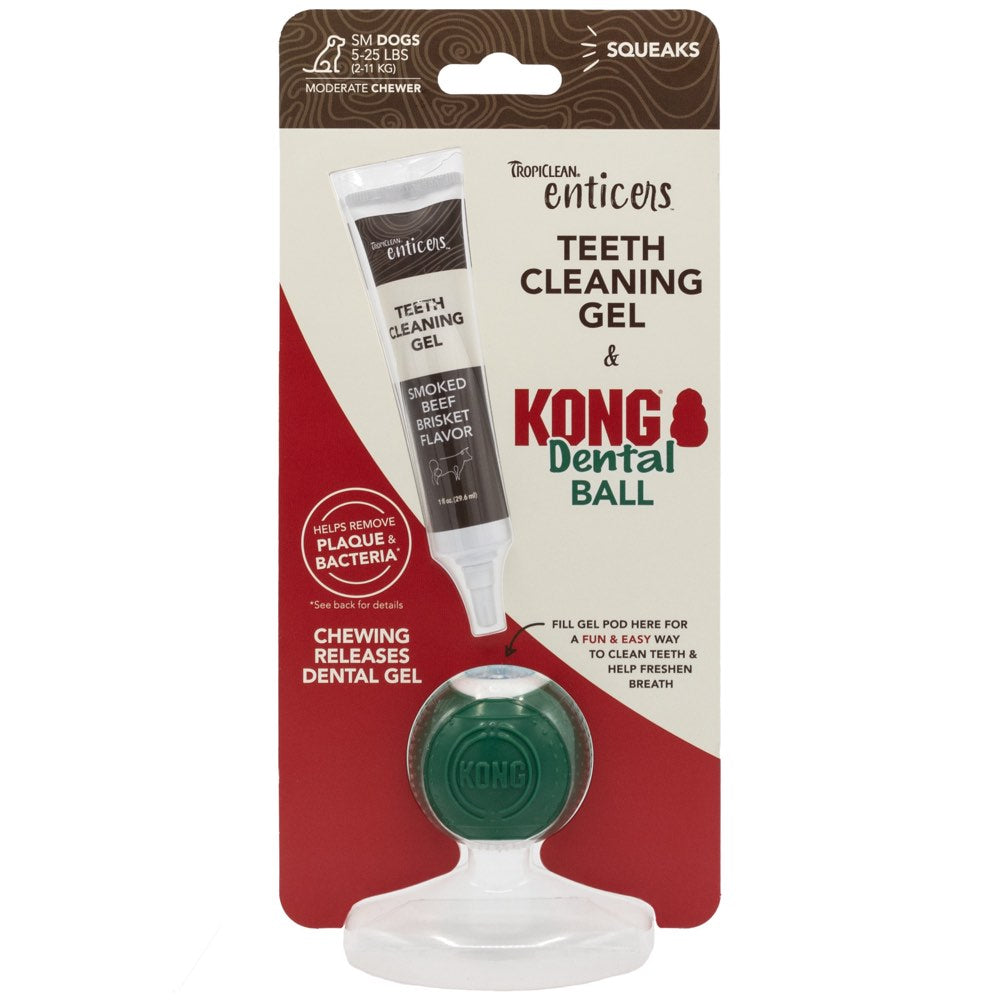 Contains one (1) 1oz tube of Enticers Teeth Cleaning Gel - Smoked Beef Brisket Flavor and one (1) KONG Dental Ball for large dogs.