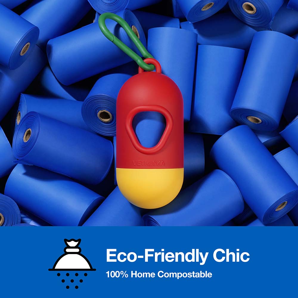 Alongside the dispenser's eye-catching design, discover the functionality of extra-thick, leak-proof blue poop bags, a striking blue hue that's 100% compostable, ensuring a sustainable choice.