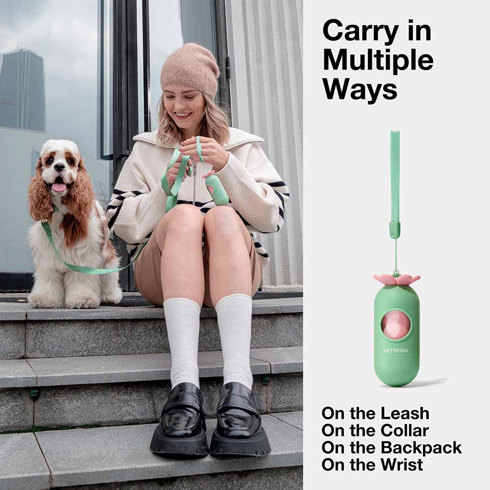 VETRESKA Flora Dog Poop Bag Dispenser’s sleek and seamless design makes it easy to tear out a single bag when on the go, and its removable bottom also makes refilling the dispenser a breeze.