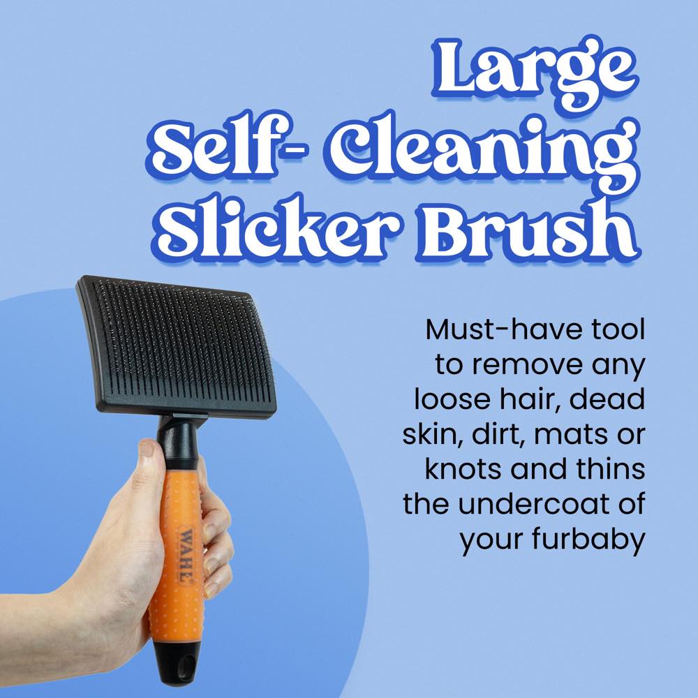 Wahl Self Cleaning Slicker Dog Brush features a handy release button at the back that pushes trapped fur forward, making it easy to clean and maintain.