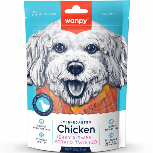 Introducing Wanpy Oven-Roasted Chicken Jerky & Sweet Potato Twists Dog Treats, the ultimate training reward for your furry companion.