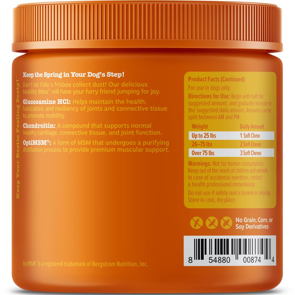 Don't let Fido's frisbee collect dust! Zesty Paws' delicious Mobility Bites are soft chews that provide hip and joint support to keep your furry friend jumping for joy.
