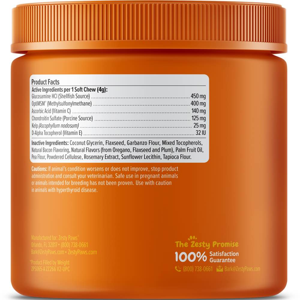 Active Ingredients: Glucosamine HCl (Shellfish), Methylsulfonylmethane (OptiMSM®), Vitamin C (Ascorbic Acid), Chondroitin Sulfate (Porcine), Kelp (Ascophyllum nodosum), Vitamin E (D-Alpha Tocopherol Acetate).