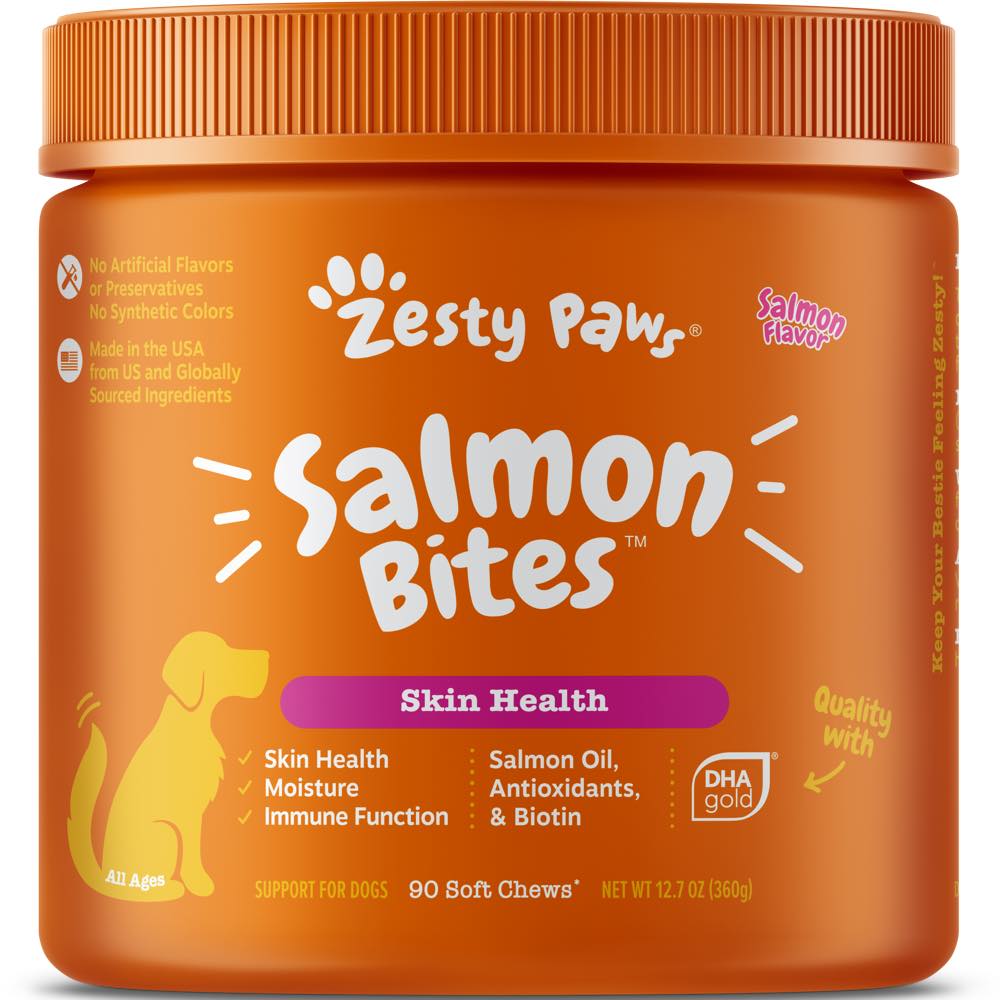 To maintain your pup’s skin health, Zesty Paws Salmon Bites can help you show Fido you care.