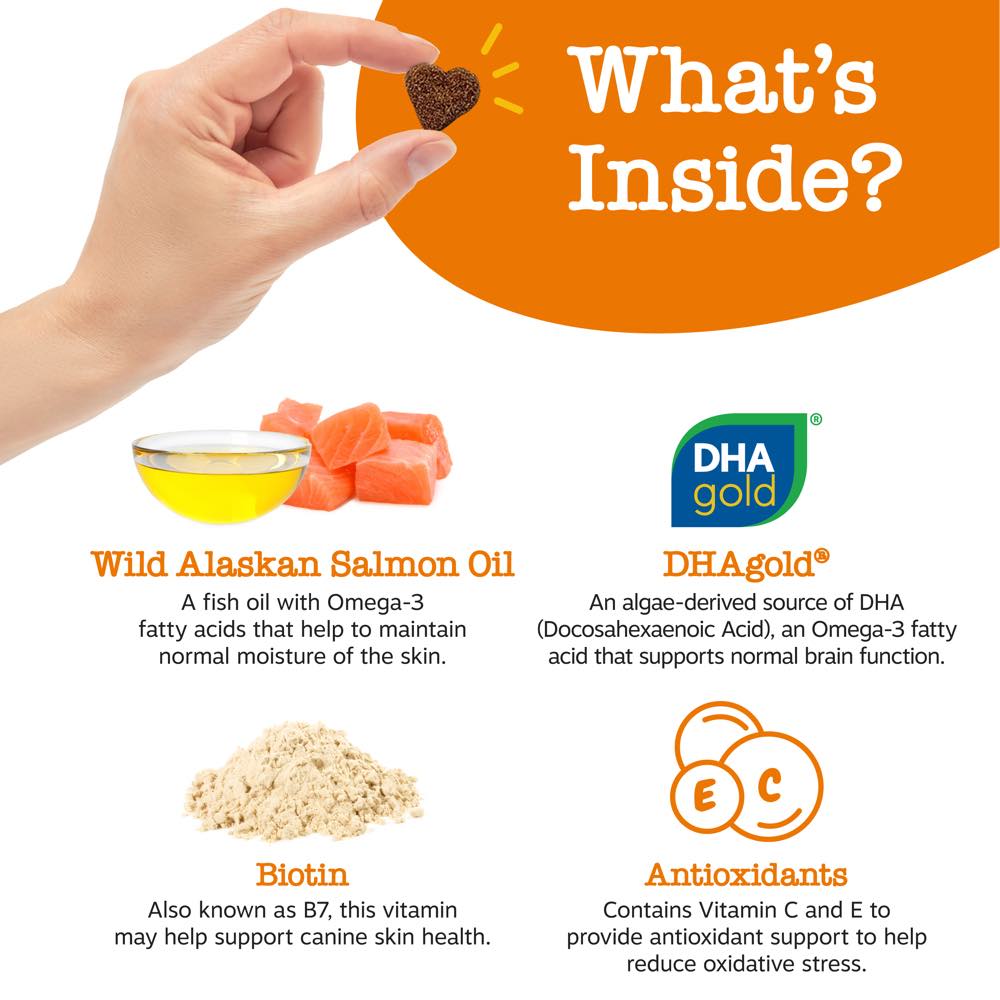 Active Ingredients: Schizochytrium sp. Algae (DHAgold®), Kelp (Ascophyllum nodosum), Salmon Oil, Vitamin C (Ascorbic Acid), Vitamin E (D-Alpha Tocopherol), Biotin.