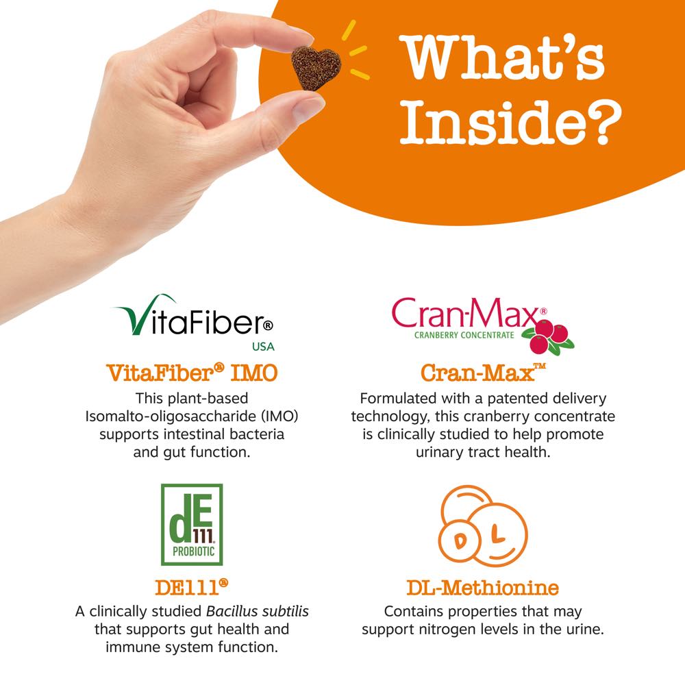 Active Ingredients: DL-Methionine Hydroxy Analogue, Isomalto-oligosaccaride (VitaFiber™), Digestive Health Blend (Protease, Amylase, Lipase, Cellulase, Papain, Hemicellulase, Bromelain), Apple Cider Vinegar, Cranberry Concentrate (CranMax®), Bacillus Coagulans, Bacillus Subtilis (DE111®).